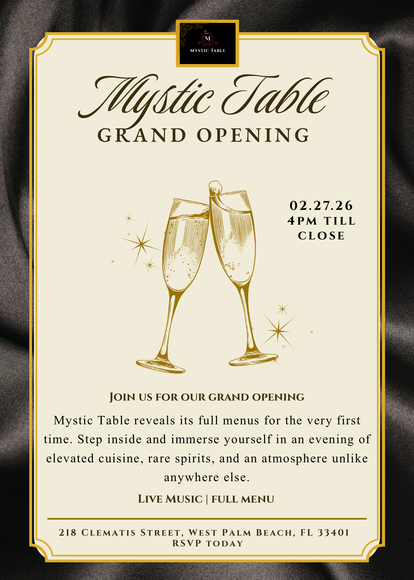 Mystic Table is officially opening our doors to welcome all things Mystic. Come experience our full menu, specially curated cocktails at our Magic Bar, live music and so much more.